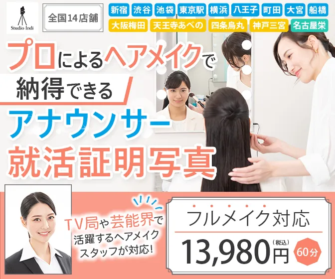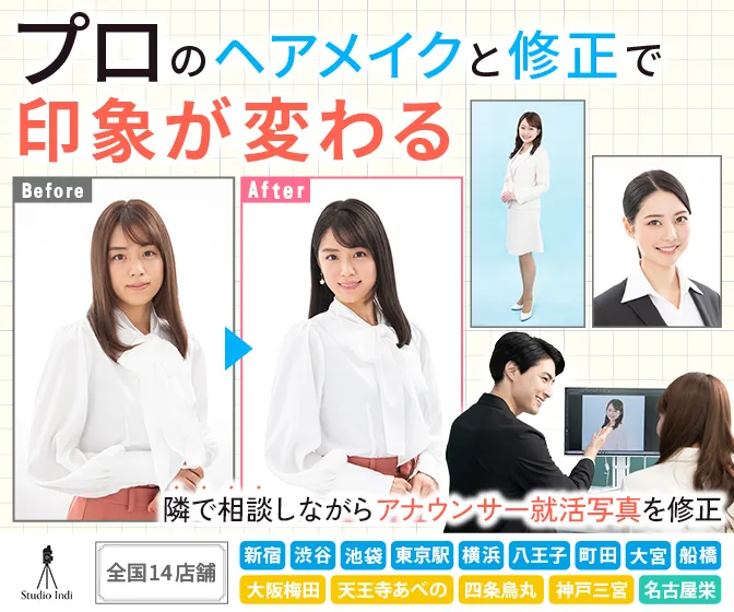 アナウンサーの就活ES写真は「スタジオインディ」アナウンサーのES写真はメイクの自由度が高いことがポイント